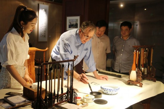 This photo shows Australian Nobel prize laureate Barry Marshall at a Chinese calligraphy desk. (Xinhua)