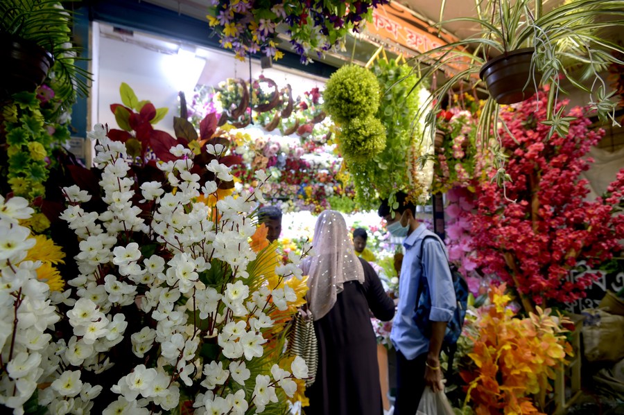 People visit a flower shop selling artificial polyester flowers imported from China in Dhaka, Bangladesh, Dec. 11, 2022. (Xinhua)