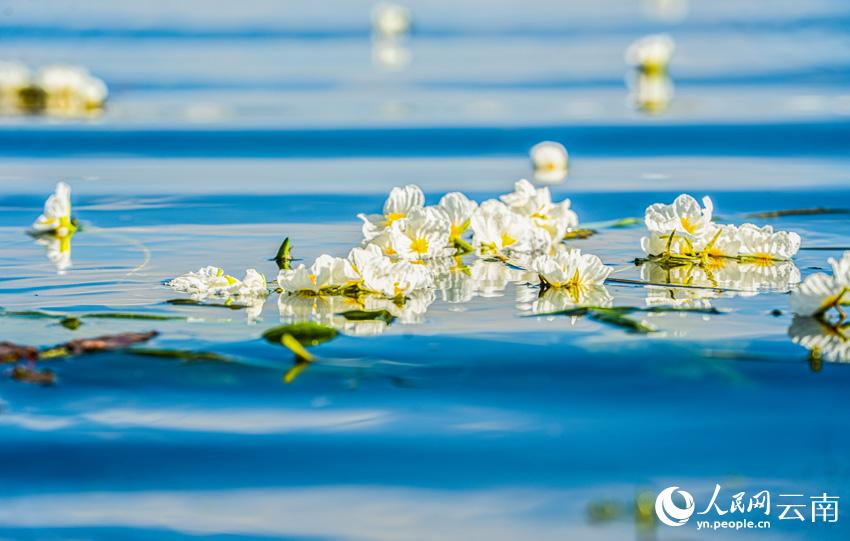 Photo shows blooming ottelia acuminata, an aquatic species endemic to China, on Erhai Lake in southwest China's Yunnan Province, June 2022. (Photo/Wang Jicheng)