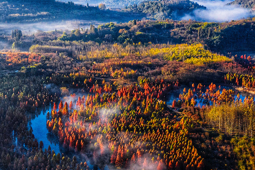 Photo shows a gorgeous winter view of a wetland of dawn redwoods in Dianwei village, Panlong district, Kunming city, capital of southwest China’s Yunnan Province, December 2022. (Photo courtesy of the media convergence center of Panlong district)