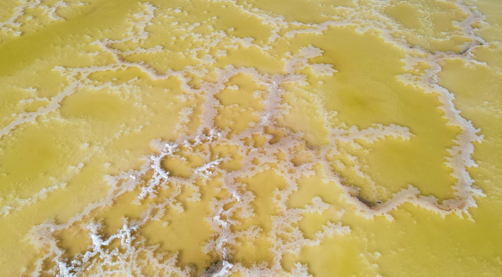 Once the temperature falls below a certain threshold in winter, molecules of magnesium sulfate and sodium sulfate in the lake will be activated to crystallize into translucent “magnesium flowers” and snow-white “mirabilite flowers” respectively, creating a stunning scene of blossoms in the cold.