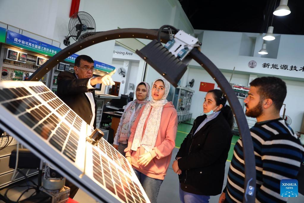 Professor Mohamad Ahmed Awad (1st L), director of Luban Workshop, introduces simulated wind-photovoltaic hybrid generating system to trainees at the workshop at Ain Shams University in Cairo, Egypt, on Dec. 21, 2022. (Xinhua/Ahmed Gomaa)