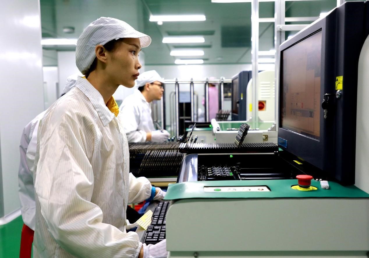 Workers produce 5G communication modules and terminals in a digital workshop of a tech firm in Quannan county, Ganzhou, east China's Jiangxi province, May 31, 2022. (People's Daily Online/Yin Qiqi)