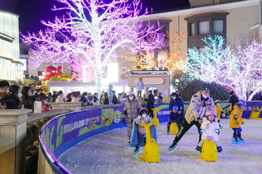 Children skate at a business center in Beijing, capital of China, Dec. 24, 2022. (Xinhua/Ju Huanzong)