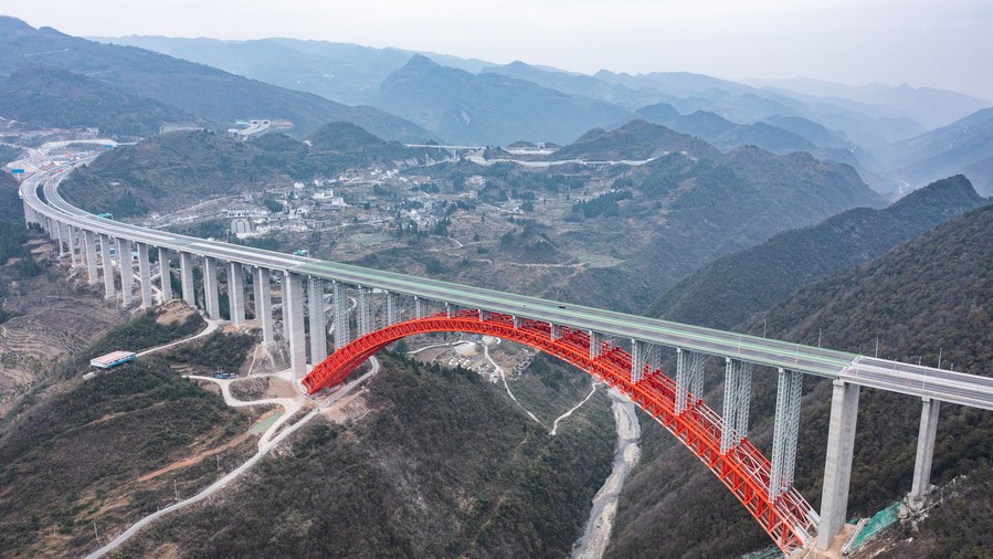 This aerial photo taken on Dec. 14, 2022 shows the Dafaqu grand bridge of an expressway linking Renhuai City and Zunyi City in southwest China's Guizhou Province. (Xinhua/Tao Liang)