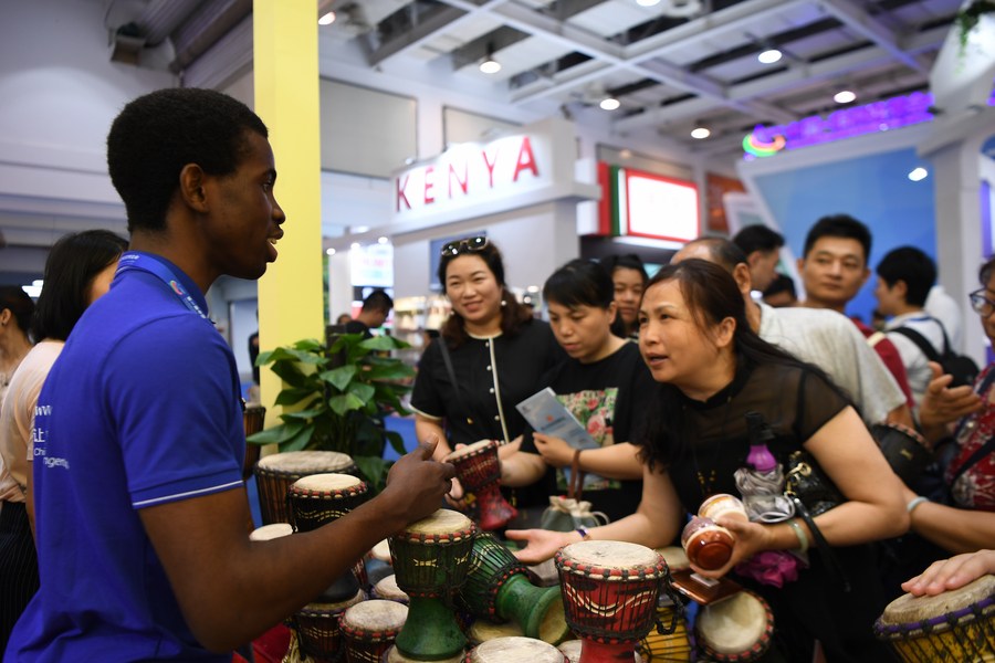 A staff member from the Republic of Ghana introduces hand drum to visitors during the China-Africa Economic and Trade Expo in Changsha, central China's Hunan Province, June 28, 2019. (Xinhua/Xue Yuge)