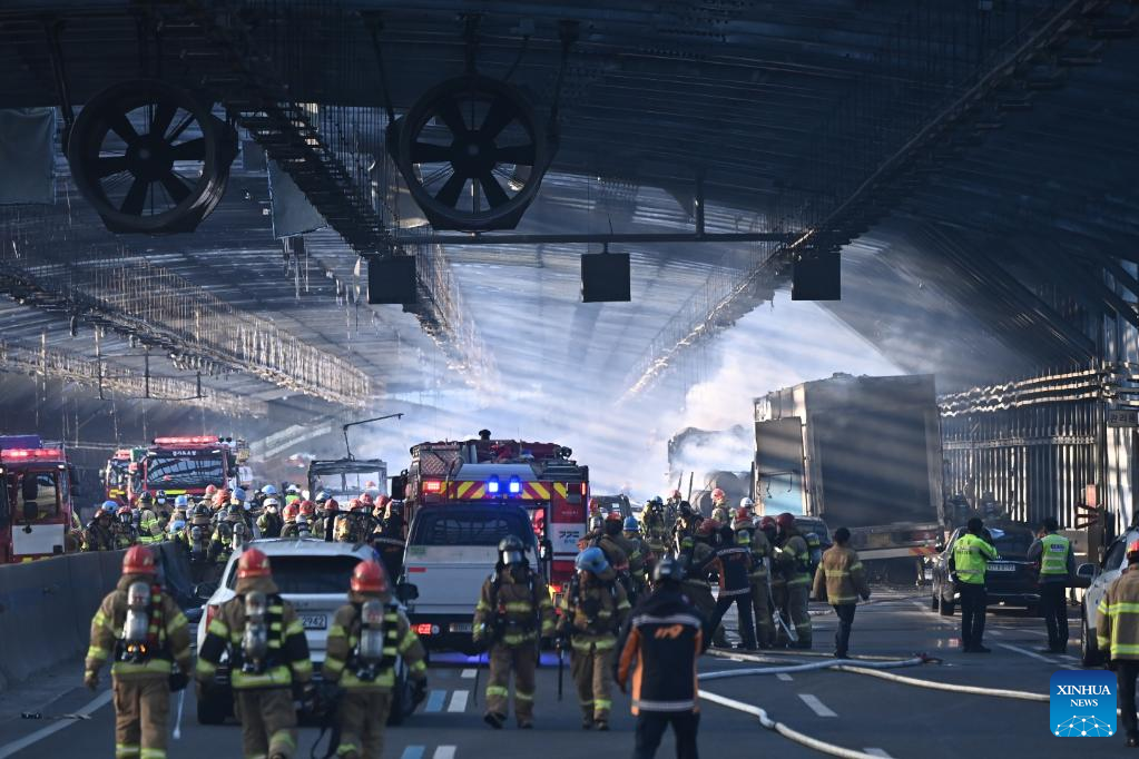 Firemen work at the fire site at a sound-proof tunnel of the second Gyeongin expressway in Gwacheon, South Korea, Dec. 29, 2022. (NEWSIS via Xinhua)