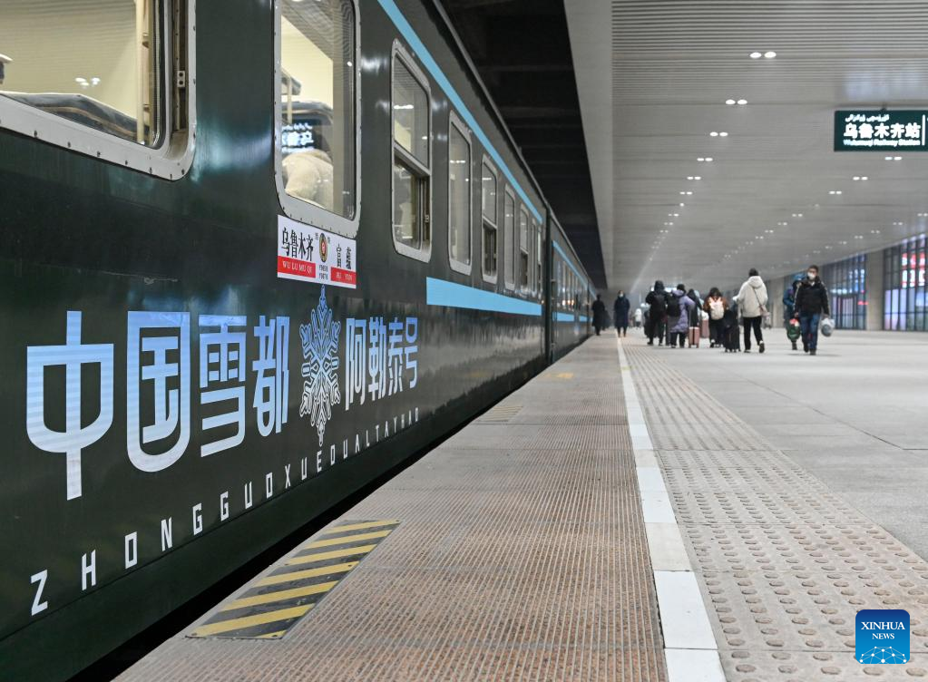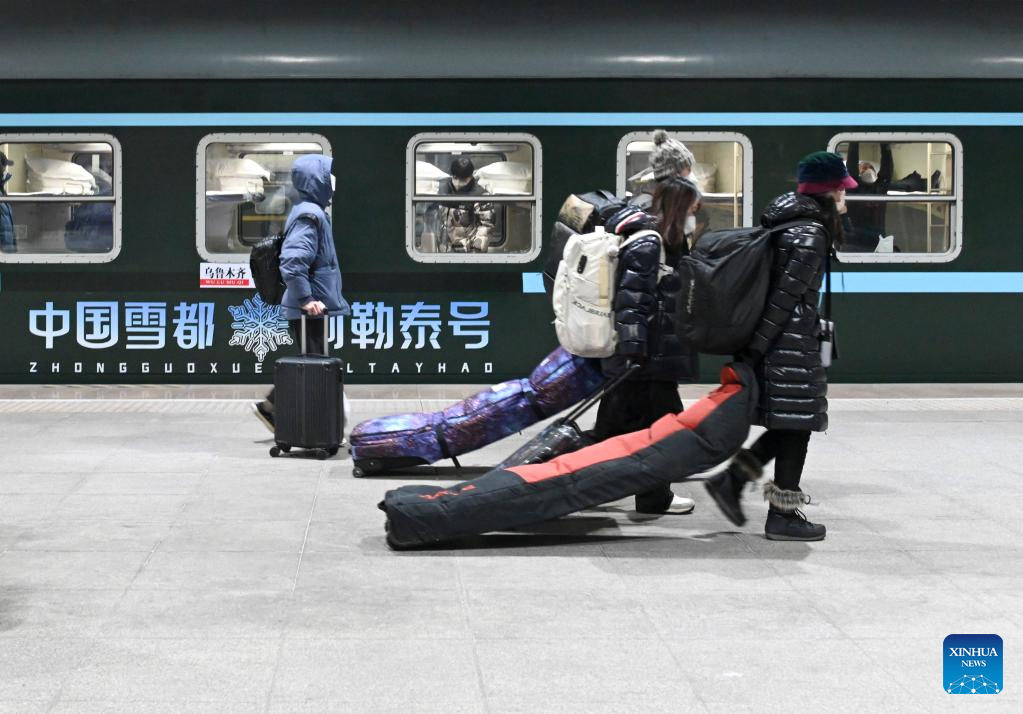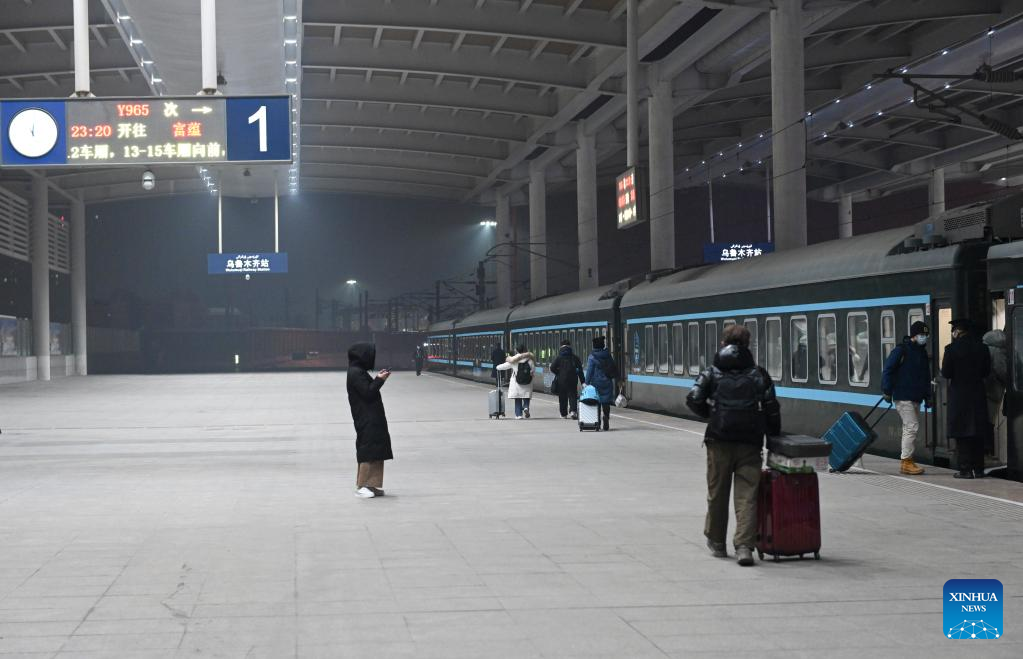 Passengers board the train Y965, a passenger train for ice and snow travel, at Urumqi station in Urumqi, northwest China's Xinjiang Uygur Autonomous Region, Dec. 28, 2022. (Xinhua/Hao Jianwei)