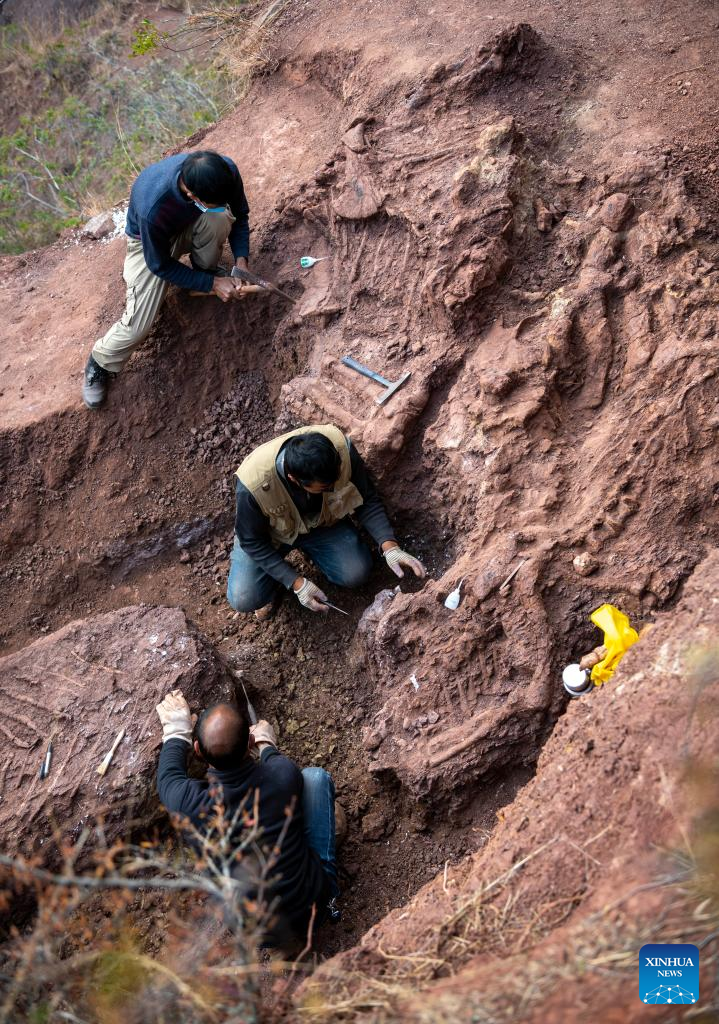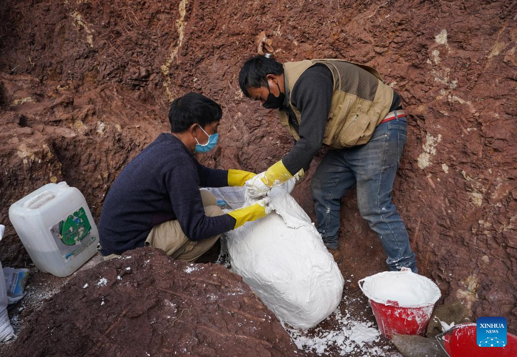 Dinosaur fossils are excavated at a locality in Lufeng City of Chuxiong Yi Autonomous Prefecture, southwest China's Yunnan Province, Dec. 28, 2022. (Xinhua/Chen Xinbo)