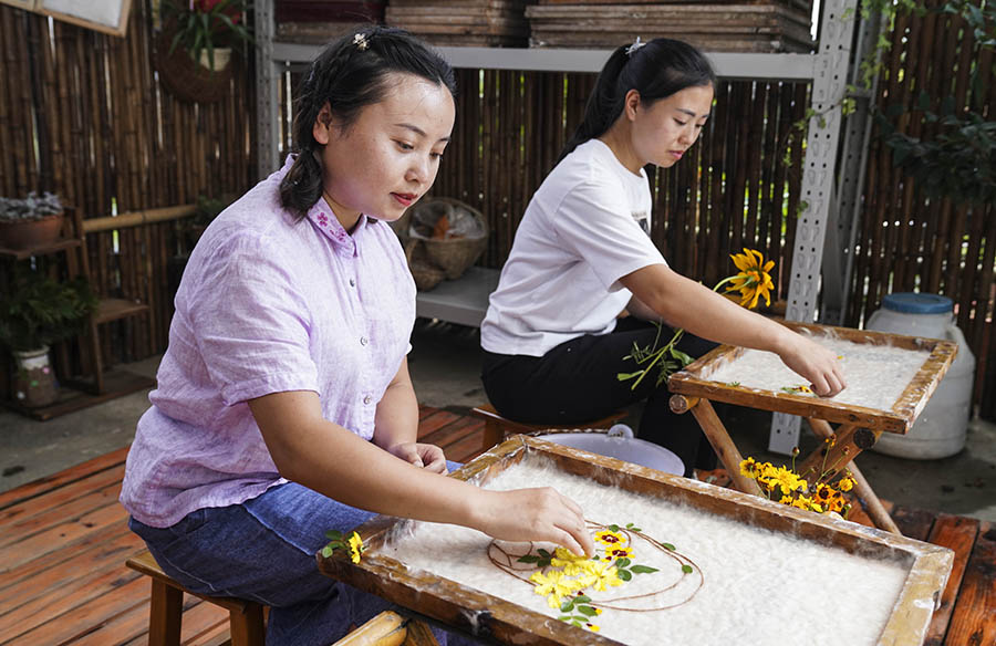Zhang has injected new vitality into the ancient craft by introducing papermaking artwork made with flowers and leaves while diversifying the products made using paper, including fans, bookmarks, and notebooks, which have been well received by tourists.