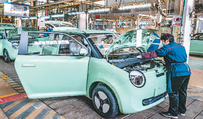 A worker is busy on a new energy vehicle production line at a workshop of Nanjing Chang’an Automobile Co., Ltd. in Nanjing city, east China’s Jiangsu Province. (Photo/Zhu Hongsheng)