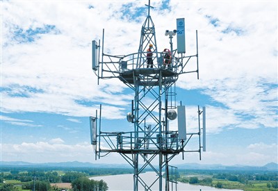 Workers adjust an antenna at a 5G base station in Xuba township, Tongling city, east China’s Anhui Province. (People’s Daily/Guo Shining)