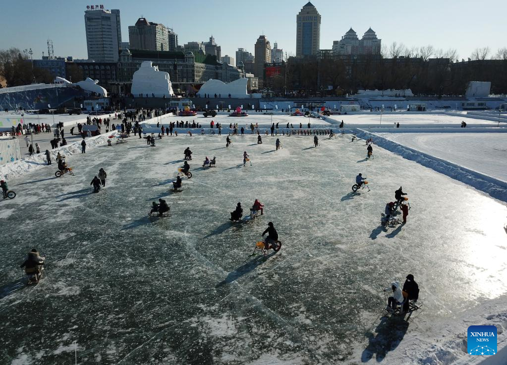 Tourists play at the Ice and Snow Carnival park on the Songhua River in Harbin, northeast China's Heilongjiang Province, Jan. 1, 2023. (Xinhua/Zhang Tao)