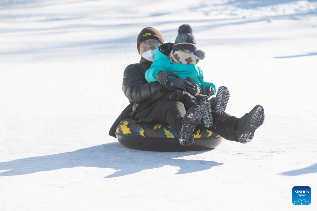 Tourists play at the Ice and Snow Carnival park on the Songhua River in Harbin, northeast China's Heilongjiang Province, Jan. 1, 2023. (Xinhua/Wang Jianwei)