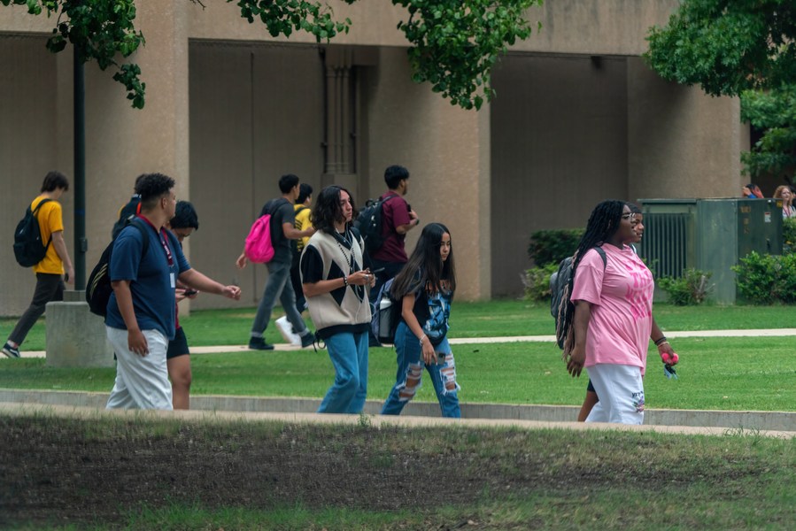 High school students walk on a campus in Plano, Texas, the United States, on Aug. 31, 2022. (Photo by Xin Jin/Xinhua)