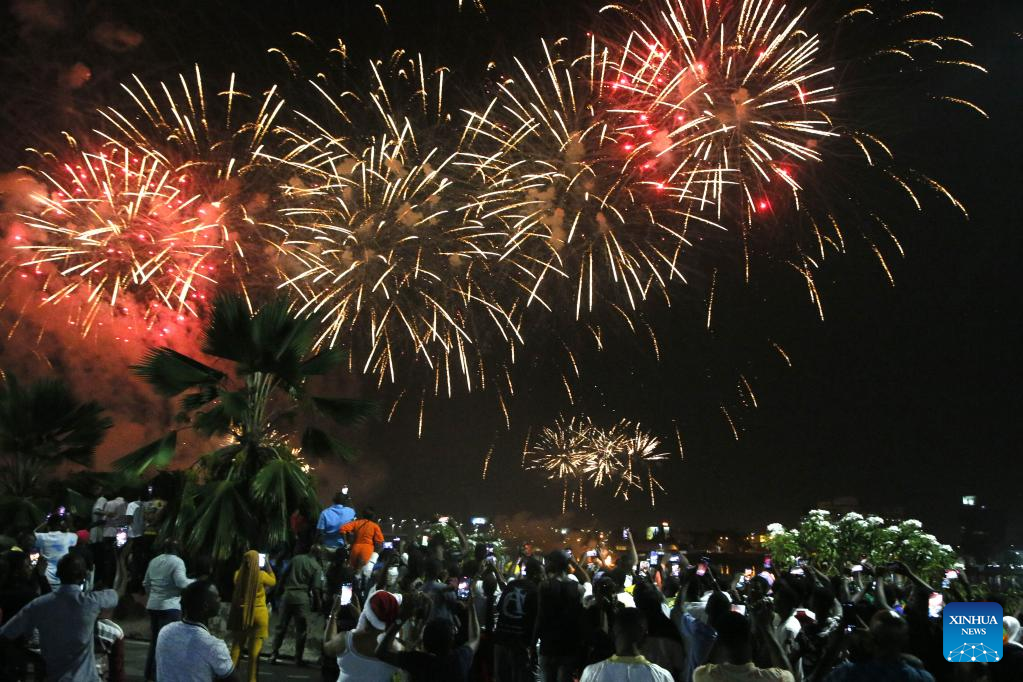 People watch fireworks to celebrate the New Year in Abidjan, Cote d'Ivoire, Jan. 1, 2023. (Photo by Yvan Sonh/Xinhua)