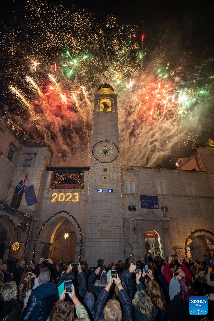 People celebrate the New Year in Dubrovnik, Croatia on Jan. 1, 2023. (Grgo Jelavic/PIXSELL via Xinhua)