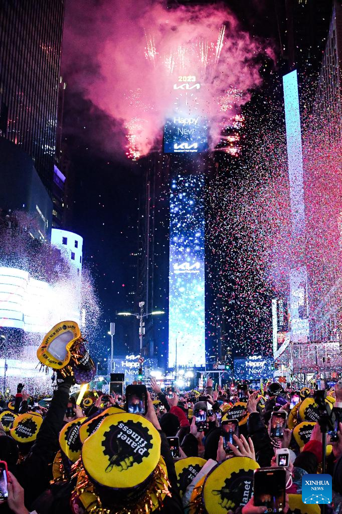 Fireworks are seen during the Times Square New Year celebration in New York, the United States, on Jan. 1, 2023. (Photo by Ziyu Julian Zhu/Xinhua)