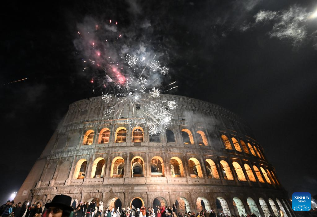 Fireworks explode near the Colosseo during the New Year celebrations in Rome, Italy, on Jan. 1, 2023. (Photo by Alberto Lingria/Xinhua)