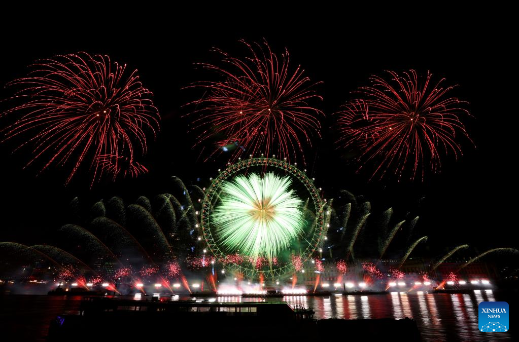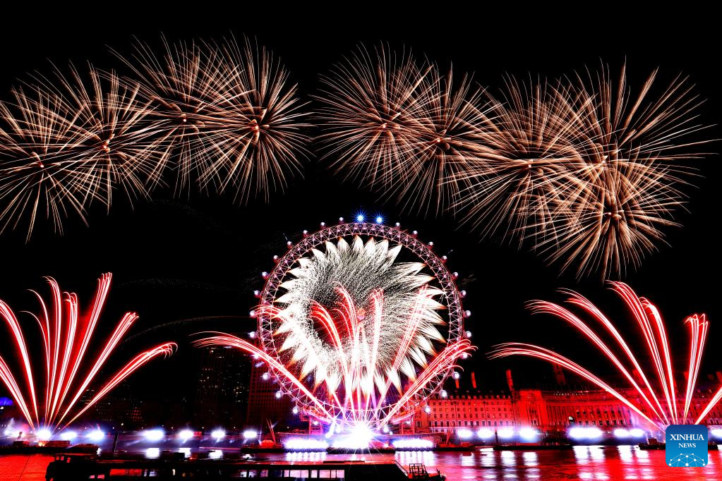 Fireworks explode over the London Eye during the New Year celebrations in London, Britain, on Jan. 1, 2023. (Xinhua/Li Ying)
