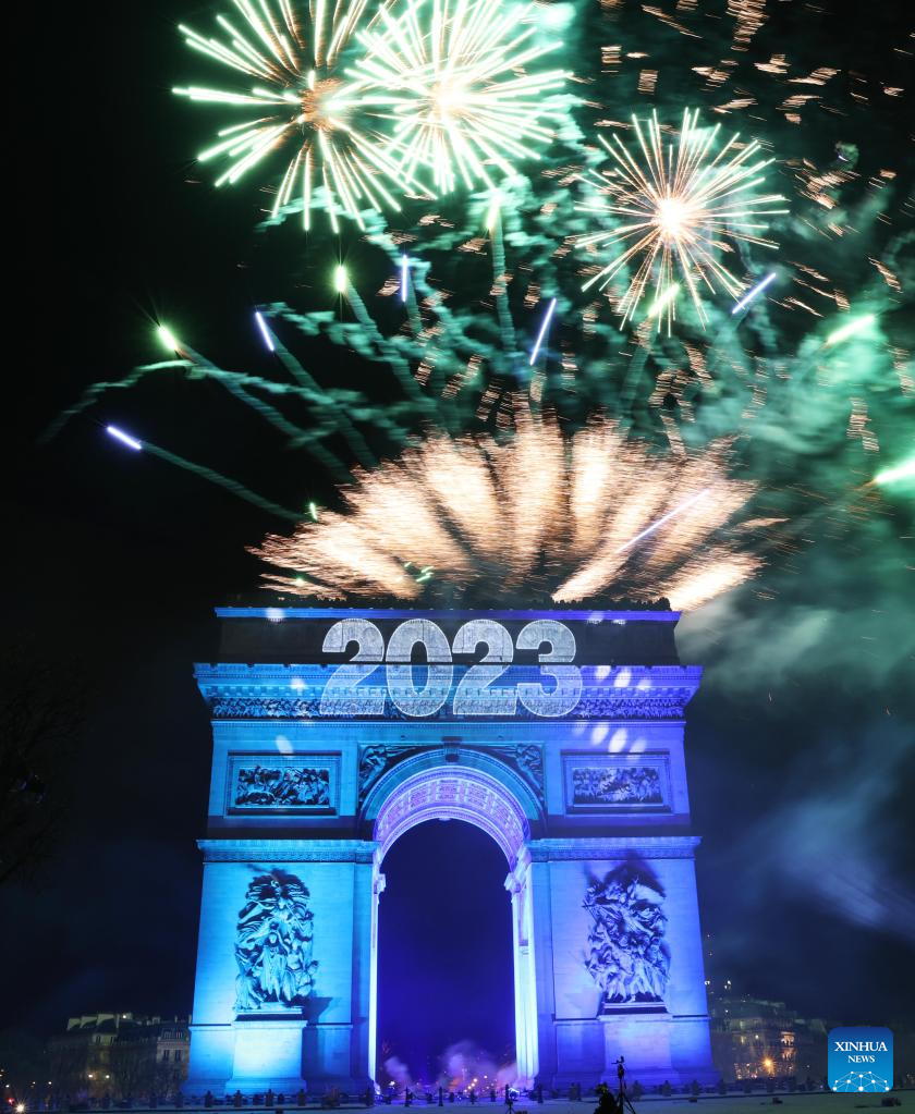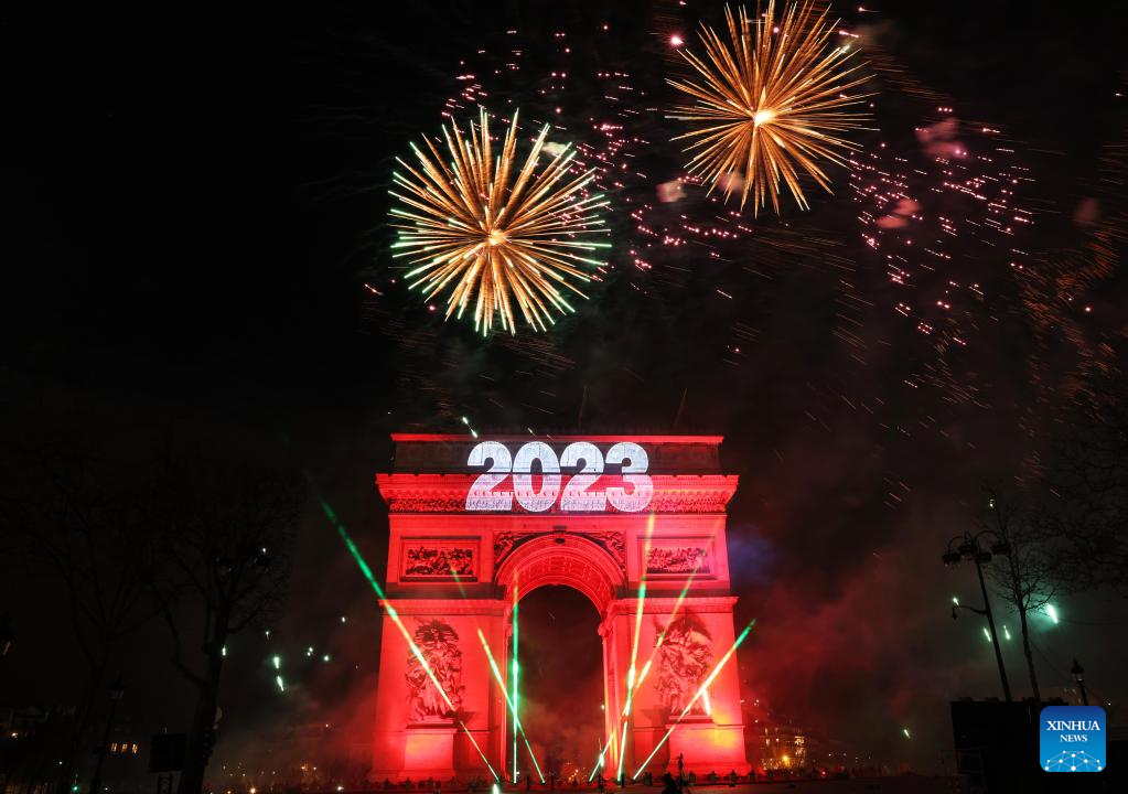 Fireworks illuminate the sky over the Arc de Triomphe during the New Year's celebrations on the Champs-Elysees Avenue in Paris, France, on Jan. 1, 2023. (Xinhua/Gao Jing)