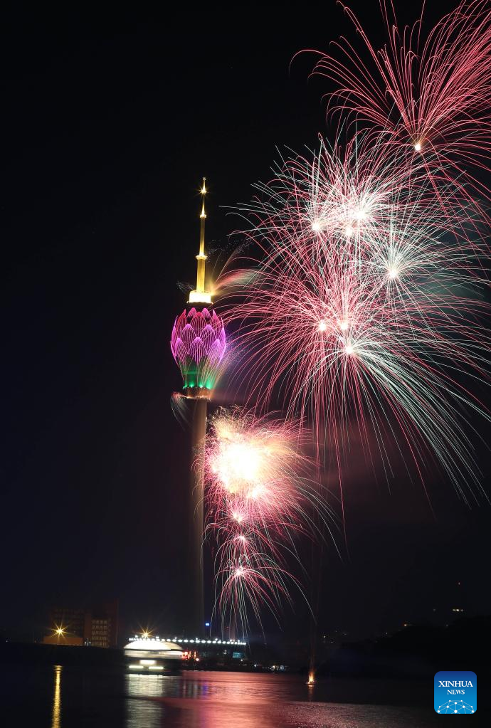 Fireworks light up the sky on New Year's eve at the Lotus Tower, a landmark in Colombo, Sri Lanka, Dec. 31, 2022. (Photo by Ajith Perera/Xinhua)