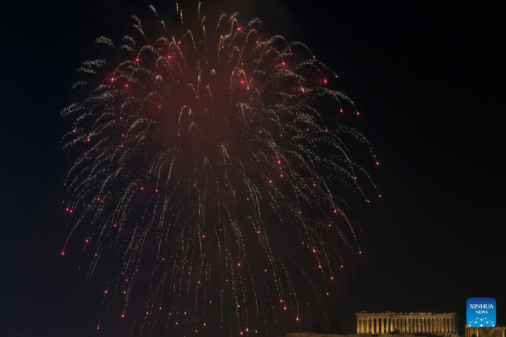 Fireworks explode by the Acropolis during the New Year celebrations in Athens, Greece, Jan. 1, 2023. (Xinhua/Marios Lolos)