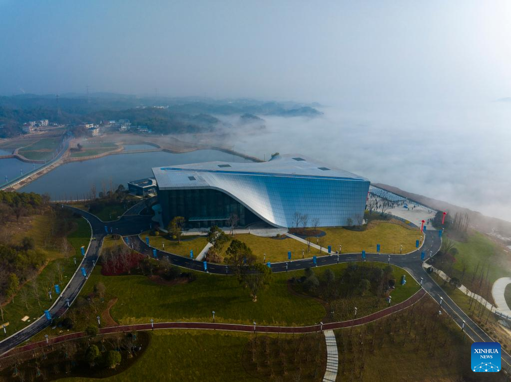 This aerial photo taken on Dec. 31, 2022 shows an aquatic organism conservation center to protect biodiversity in the Yangtze River and Poyang Lake, in Hukou County of Jiujiang City in east China's Jiangxi Province. (Xinhua)