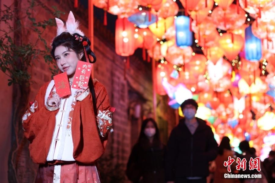 Colorful lanterns are illuminated to welcome the upcoming Year of the Rabbit in Nanjing, east China's Jiangsu Province, Jan. 3, 2022. (Photo: China News Service/Yang Bo)