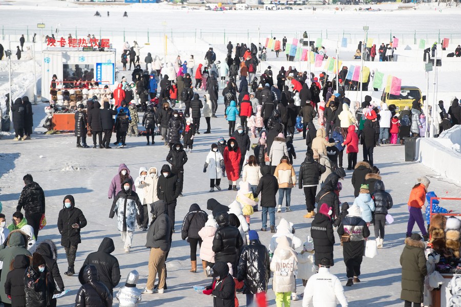 Tourists play at the Ice and Snow Carnival park on the Songhua River in Harbin, northeast China's Heilongjiang Province, Jan. 1, 2023. The three-day New Year holiday witnessed a strong recovery in tourism, catering and retail sales across the country. (Xinhua/Zhang Tao)