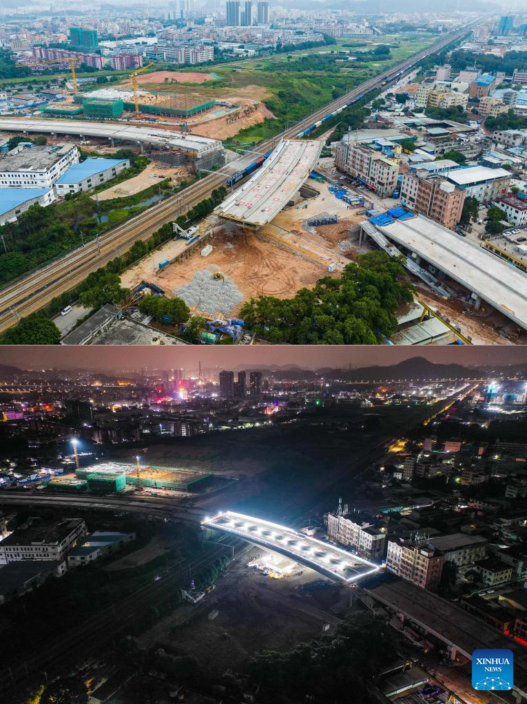 This combo aerial photo taken on Jan. 3 (up) and Jan. 4, 2023 shows a swivel girder above the Guangzhou-Shenzhen Railway in Dongguan, south China's Guangdong Province. (Xinhua/Liu Dawei)
