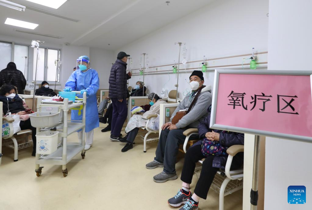 Patients receive oxygen therapy in a community healthcare institution in east China's Shanghai, Jan. 4, 2023. (Xinhua/Fang Zhe)