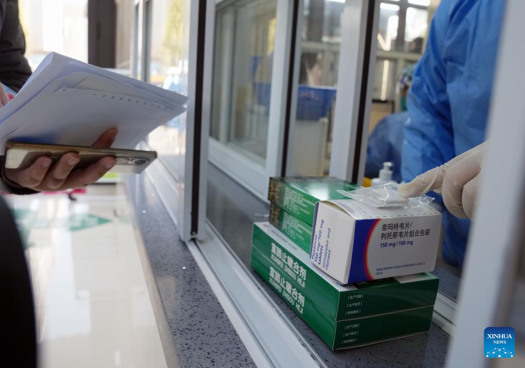 A pharmacist gives medicines to a patient's relative in the fever clinic of a community healthcare institution in Jiuting Town of Songjiang District, east China's Shanghai, Jan. 4, 2023. (Xinhua/Liu Ying)