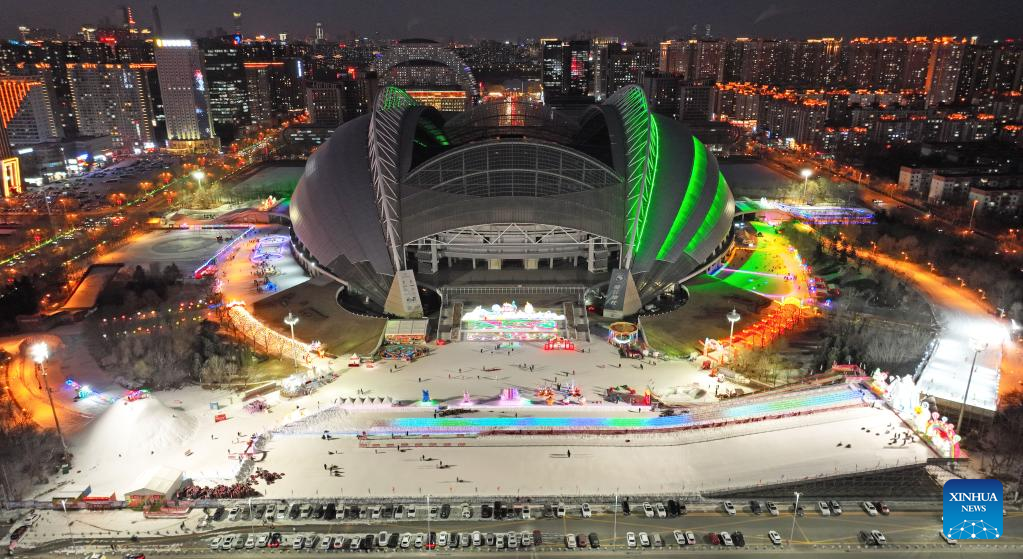 This aerial photo taken on Jan. 3, 2023 shows people enjoying ice-snow activities in Shenyang Olympic Sports Center in Shenyang, northeast China's Liaoning Province. (Xinhua/Yang Qing)
