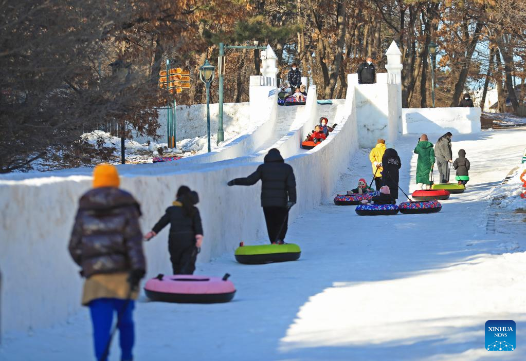 Tourists play on snow tubes in Shenyang Expo Garden in Shenyang, northeast China's Liaoning Province, Jan. 3, 2023. (Xinhua/Yang Qing)