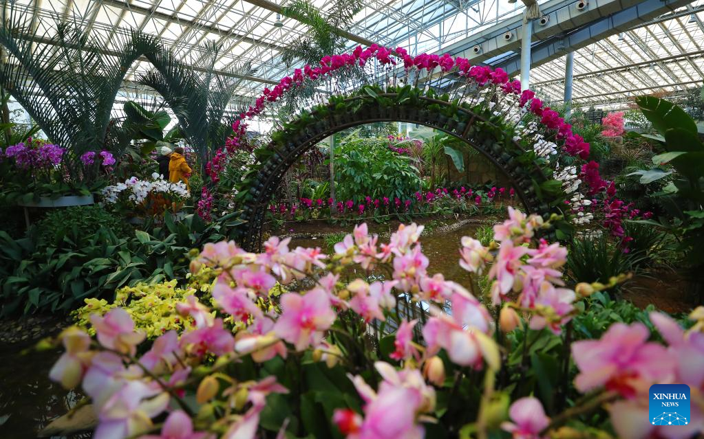 People visit a flower exhibition in Shenyang Expo Garden in Shenyang, northeast China's Liaoning Province, Jan. 3, 2023. (Xinhua/Yang Qing)