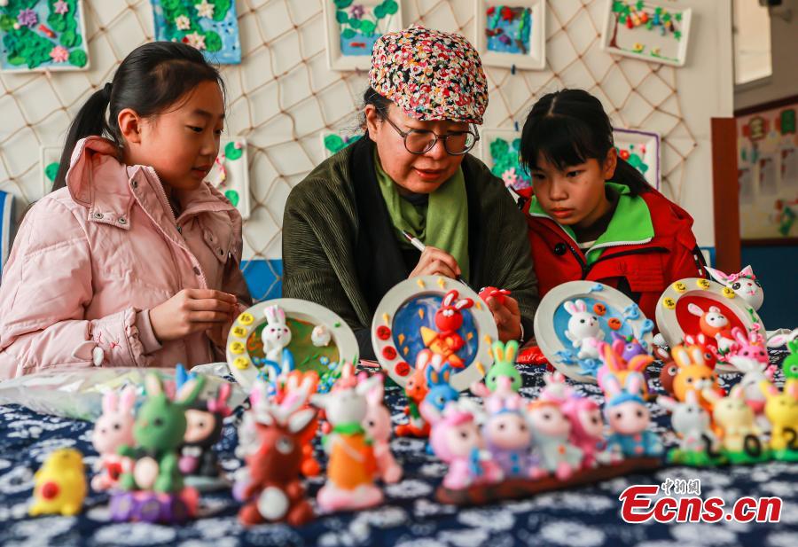 Students learn to make clay rabbit dolls to greet the Chinese Lunar New Year, or Spring Festival, in Rongcheng, east China's Shandong Province, Jan. 4, 2023. (Photo: China News Service/Li Xinjun)