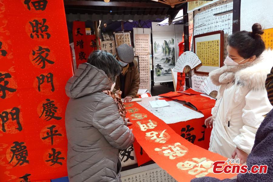 Customers select Spring Festival couplets to greet the Chinese Lunar New Year, or Spring Festival, in Guangzhou, south China's Guangdong Province, Jan. 4, 2023. (Photo: China News Service/Chen Jimin)