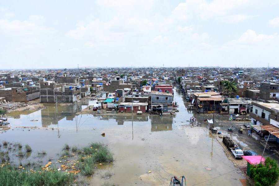 Photo taken on Aug. 26, 2020 shows a flooded area in the southern Pakistani port city of Karachi. (Str/Xinhua)