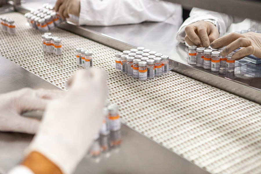 This photo taken on Aug. 31, 2022 shows the production line of COVID-19 vaccine under the Butantan Institute in the state of Sao Paulo, Brazil. (Butantan Institute/Handout via Xinhua)