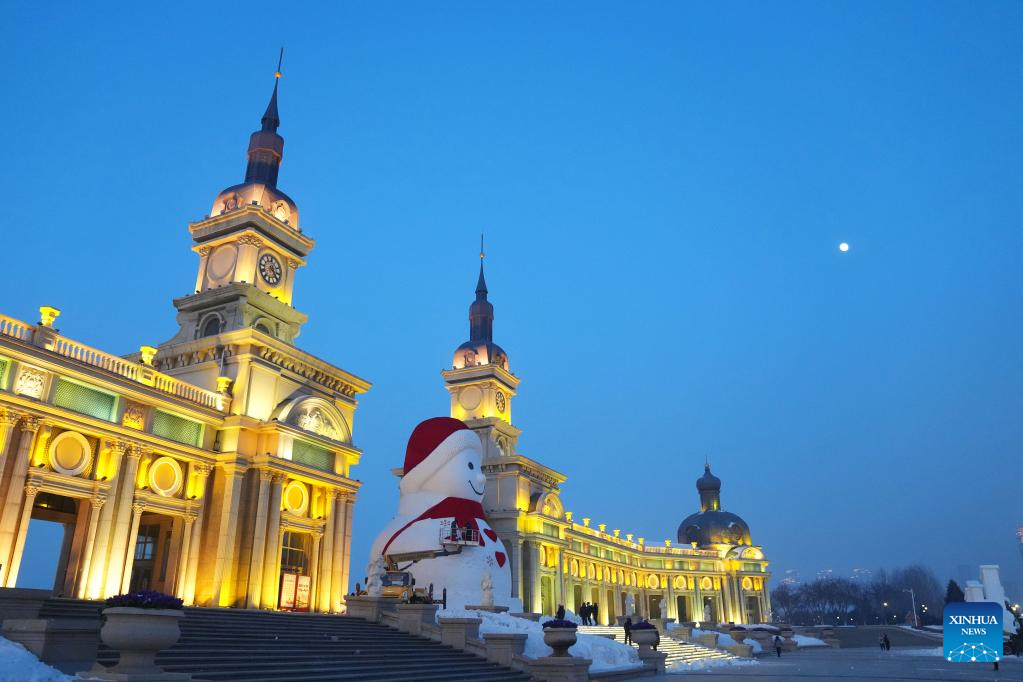 The giant snowman, 18 meters in height and made with 2,000 cubic meters of snow, becomes a landmark of Harbin, northeast China's Heilongjiang Province.