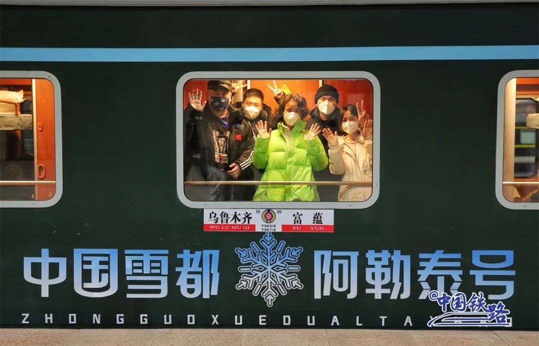 Passengers pose for a picture on a train for ice and snow travel that was recently launched in northwest China's Xinjiang Uygur Autonomous Region. (Photo/Media Convergence Center of China Railway Urumqi Bureau Group Co., Ltd.)