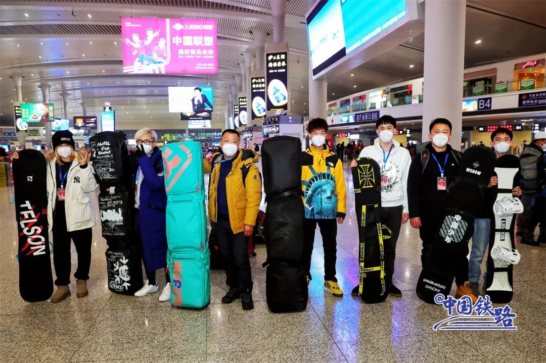Winter sports lovers pose for a picture before boarding the train. (Photo/Media Convergence Center of China Railway Urumqi Bureau Group Co., Ltd.)