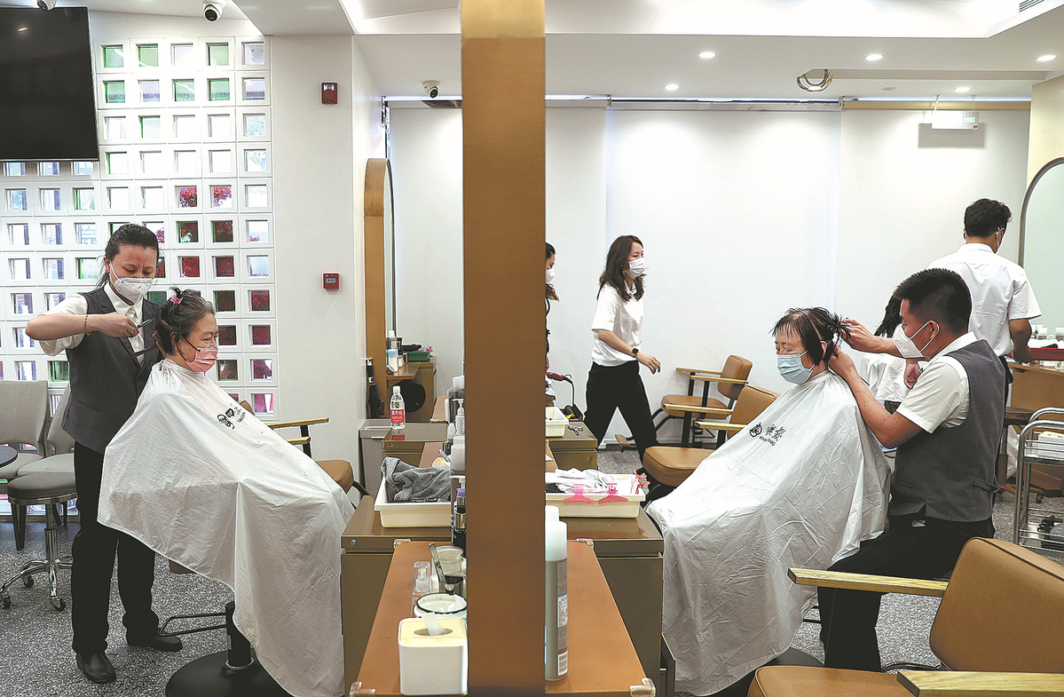 Customers are being served at the Silian Hairdressing and Beauty Center on the Wangfujing shopping street on July 27. [Photo by Zou Hong/China Daily]