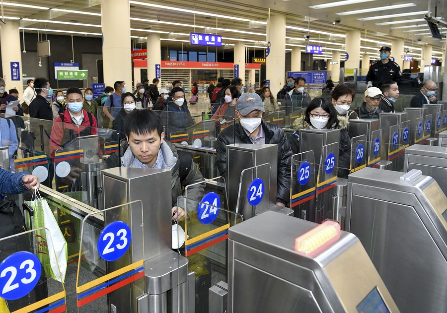 Travelers arrive at the Lok Ma Chau control point by Mass Transit Railway (MTR) in Hong Kong, south China, Jan. 8, 2023. (Xinhua/Lui Siu Wai)
