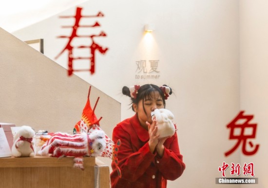 A girl poses for a photo in a store decorated for the upcoming Chinese zodiac Year of the Rabbit, or Spring Festival, in Guozijian Street, Beijing, Jan. 4, 2023. (China News Service/Hou Yu)