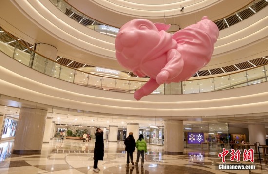 Customers look at a rabbit-shaped decoration in a shopping mall in Wuhan city, central China's Hubei Province, Jan. 3, 2023. (China News Service/Zhang Chang)