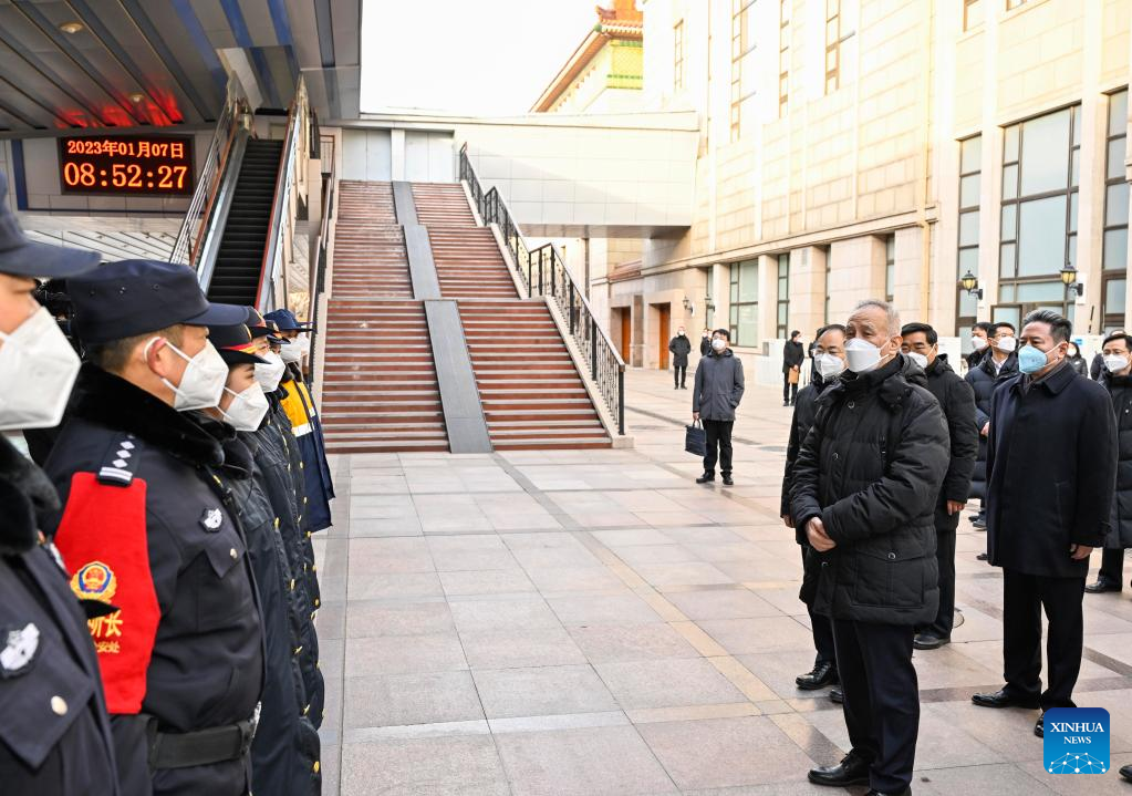 Chinese Vice Premier Liu He visits railway staff members at Beijing Railway Station when inspecting work for the Spring Festival travel rush in Beijing, capital of China, Jan. 7, 2023. (Xinhua/Yin Bogu)