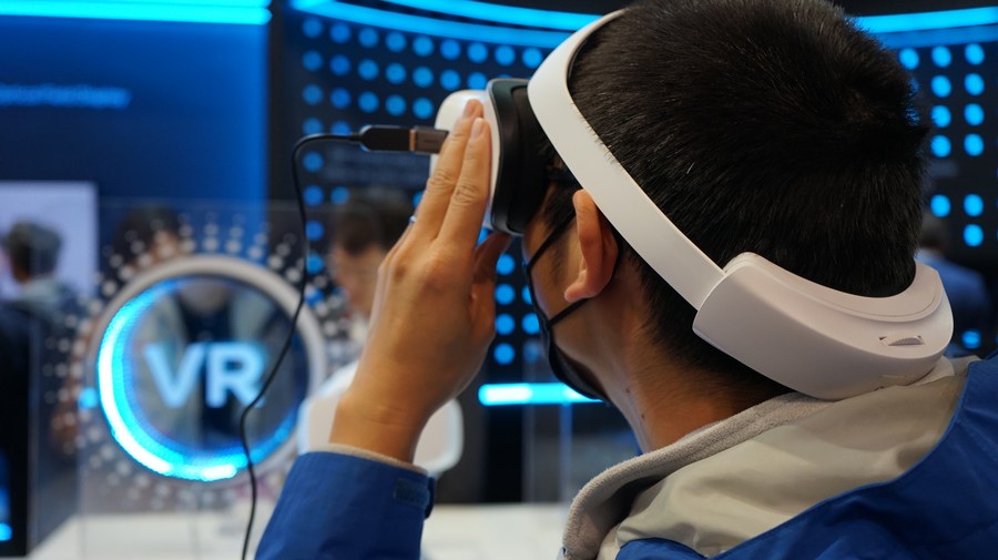 A man experiences a virtual reality (VR) product of Chinese company TCL during the 2023 Consumer Electronics Show (CES) in Las Vegas, the United States, Jan. 6, 2023. (Photo by Zeng Hui/Xinhua)