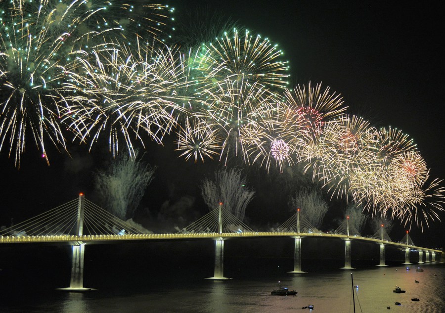 Fireworks are seen during the inauguration ceremony of the Peljesac Bridge in Komarna, Croatia, July 26, 2022. (Xinhua/Li Xuejun)